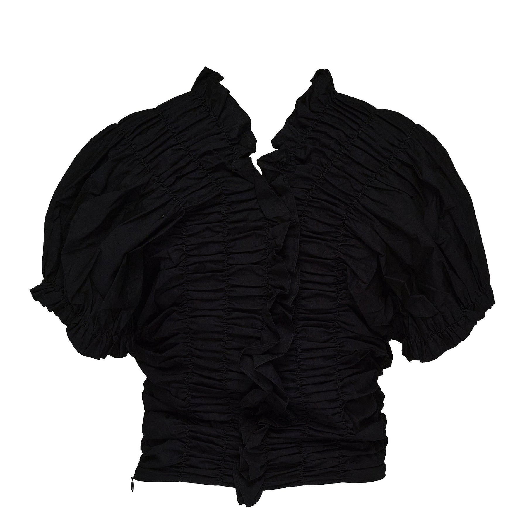 - V neckline và tay phồng ngắn với chi tiết bèo
