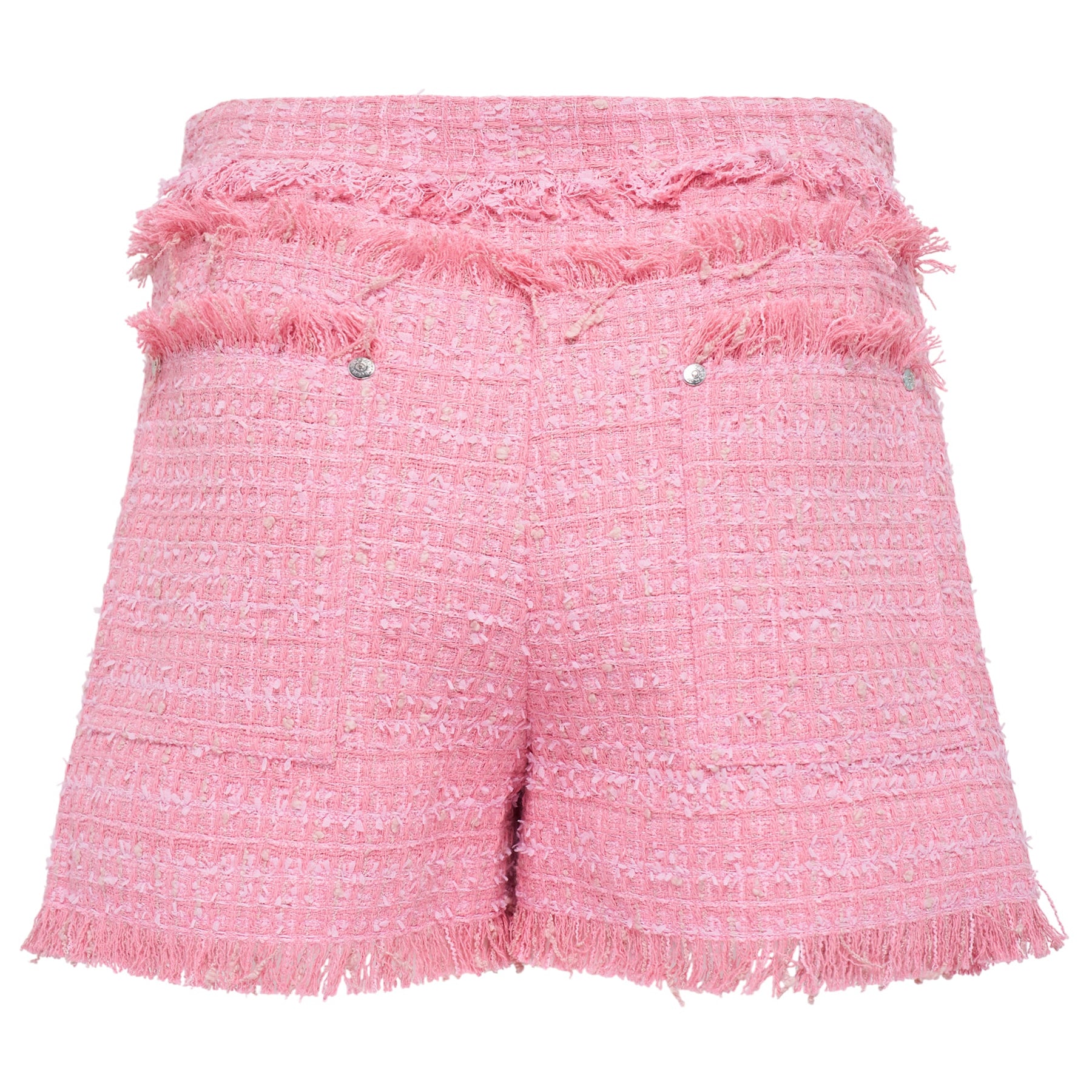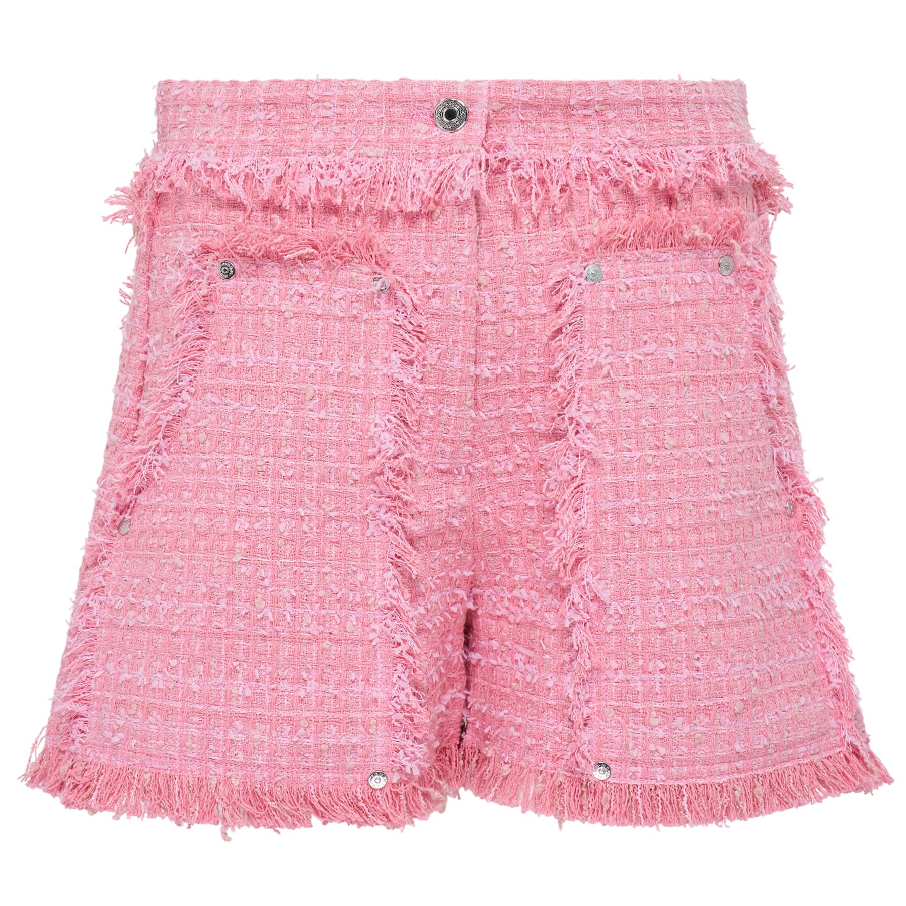 MSGM Boucle Tweed Shorts deliver Italian luxury with contemporary feminine styling and premium construction. Crafted from soft pink boucle tweed with signature frayed edges and metallic button detailing throughout. The high-waisted silhouette and textured fabric create a sophisticated statement piece perfect for elevated casual styling.