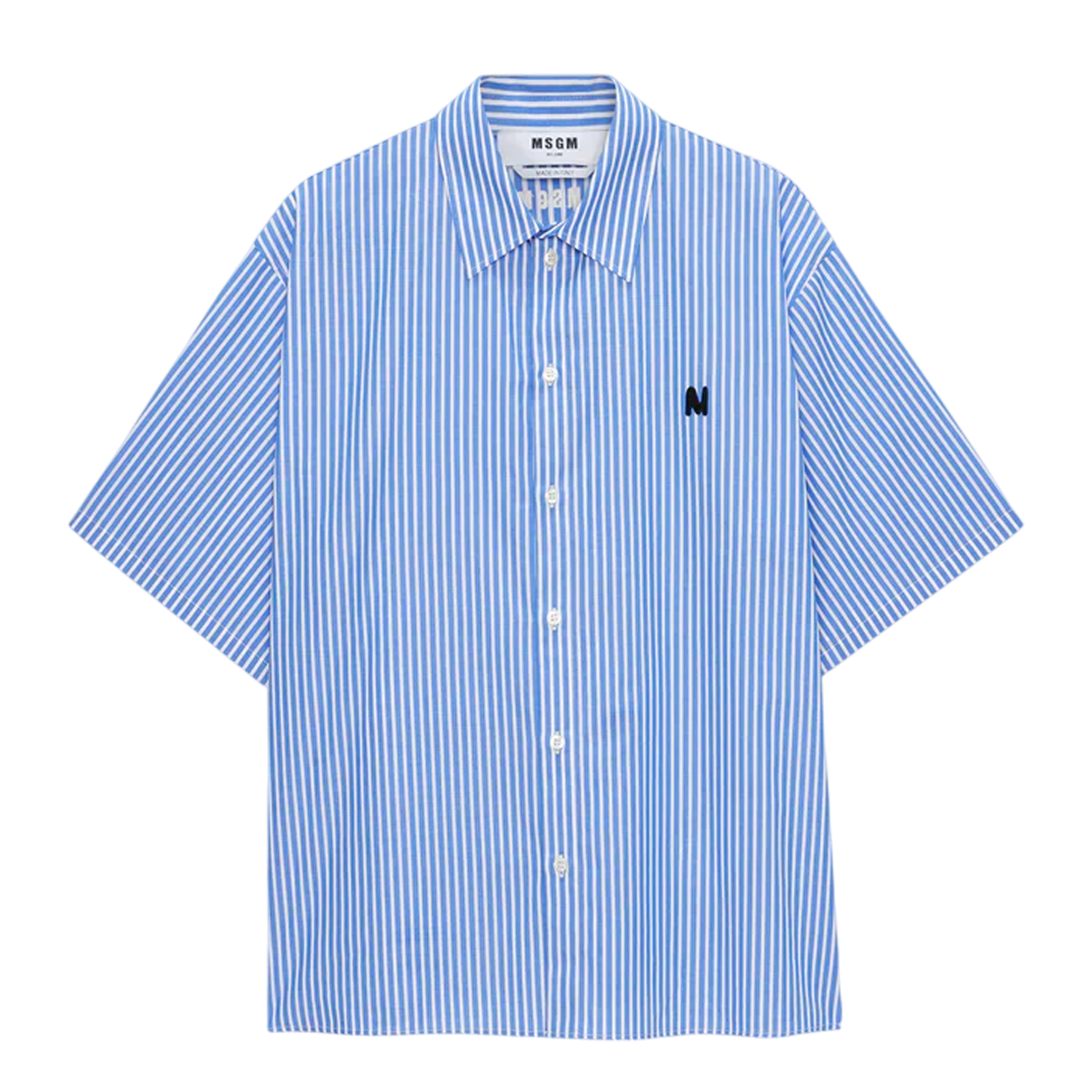 MSGM M Logo Striped Shirt delivers contemporary Italian style with bold geometric patterning and relaxed sophistication. Crafted from premium cotton poplin in crisp blue and white vertical stripes, featuring the signature M logo embroidery on the chest. The oversized silhouette and classic collar construction create versatile luxury for modern wardrobes.