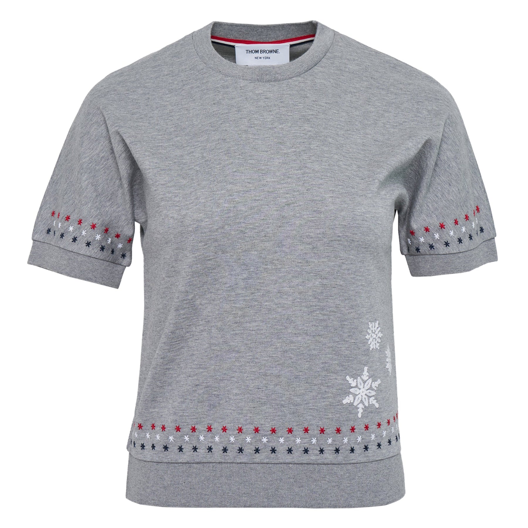 The Thom Browne Short Sleeve Dolman Tee delivers seasonal luxury with festive snowflake detailing and signature craftsmanship. Crafted from premium cotton in heather grey, featuring embroidered snowflake motifs and the brand's signature tricolor striping. The relaxed dolman silhouette and holiday-inspired design create a sophisticated statement piece for contemporary wardrobes.