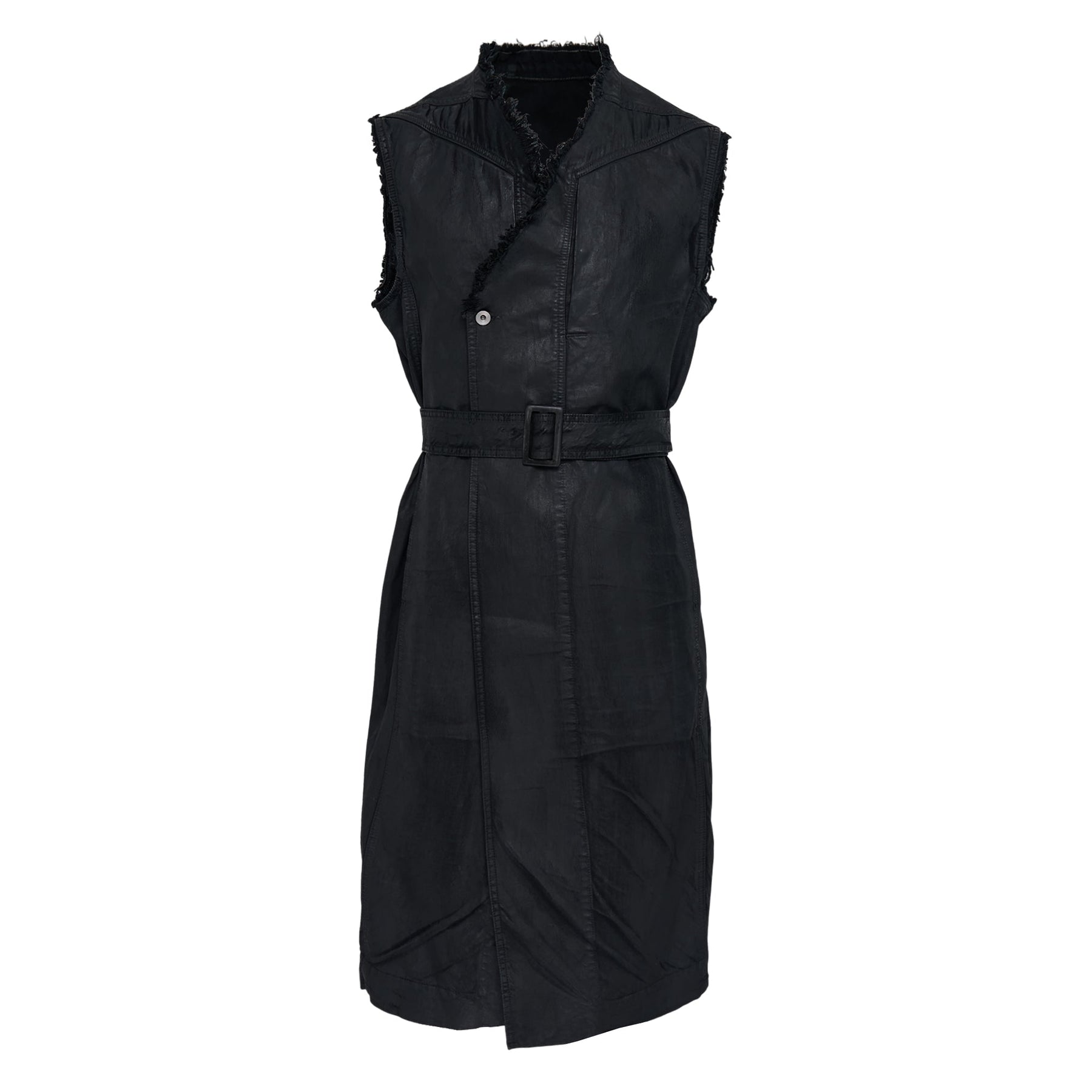 Rick Owens SL Temple Double Breasted Coat delivers avant-garde tailoring with architectural precision and contemporary edge. Crafted from 8oz premium black leather with distressed detailing and frayed edges, featuring the brand's signature deconstructed aesthetic. The belted silhouette and dramatic proportions create a bold statement piece that embodies Rick Owens' dark luxury philosophy.