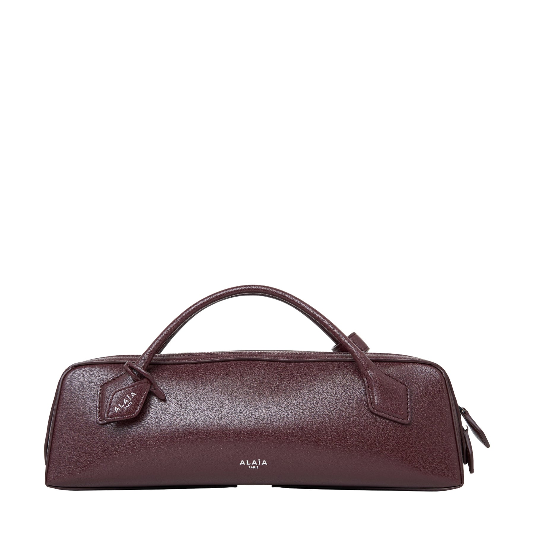 Elongated shape, tubular short handles with decorative ties, double zip closure,