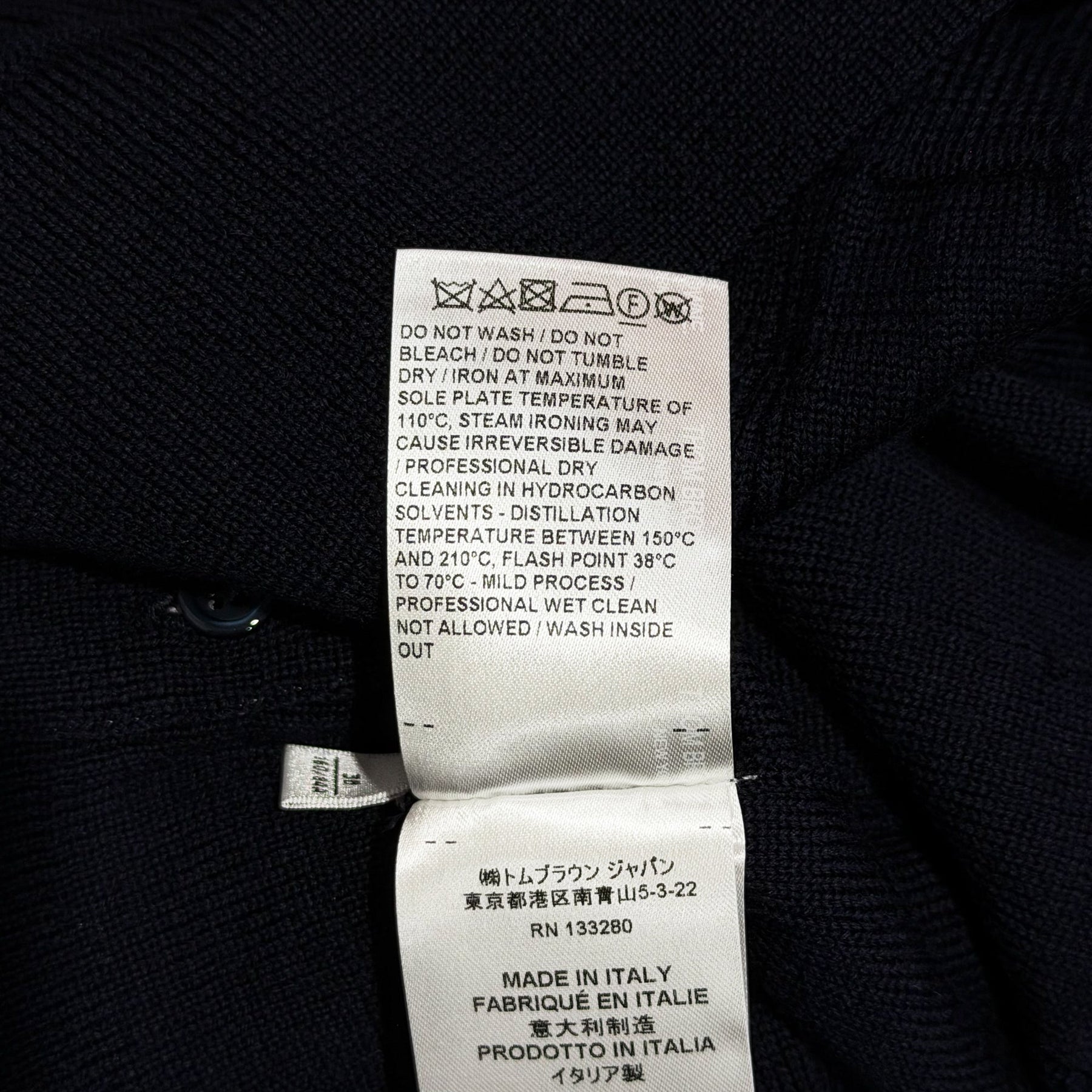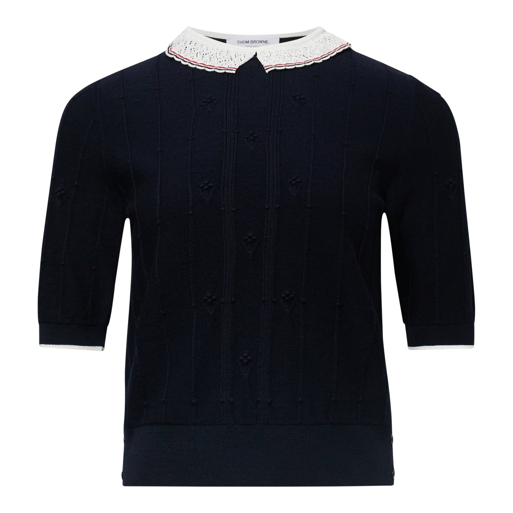 Thom Browne Bobble Stitch Cotton Knit Top delivers sophisticated preppy elegance with signature collegiate-inspired details. Crafted from premium cotton in navy with contrasting white peter pan collar featuring red and white striped trim detailing. The intricate bobble stitch construction and signature Thom Browne collar styling create a refined statement piece.