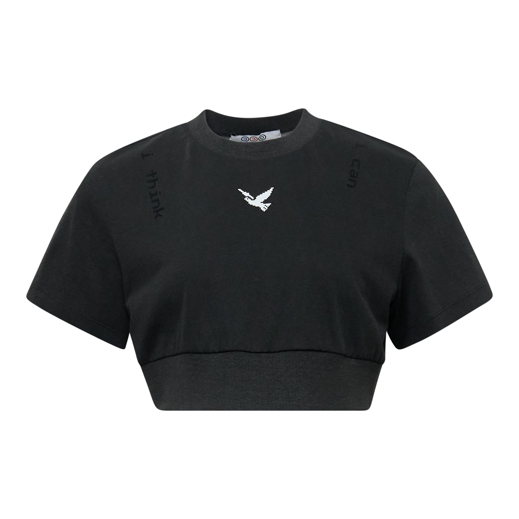 The Ordinary Couture Code I Think I Can Crop Top delivers contemporary streetwear with bold graphic detailing and modern silhouette. Crafted from soft cotton blend in classic black, featuring a white embroidered eagle motif and cropped construction. The relaxed fit and ribbed hem band create a versatile statement piece for everyday styling.