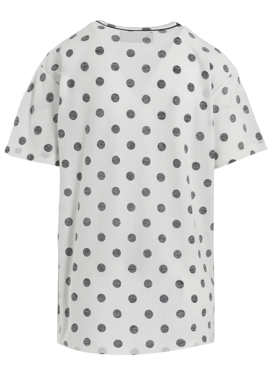 Y's cotton top features distinctive embroidered branding with a polka-dot design. It offers a slightly relaxed silhouette suitable for all genders. The neckline features an accent color line for subtle detail, making it a versatile addition to any wardrobe.